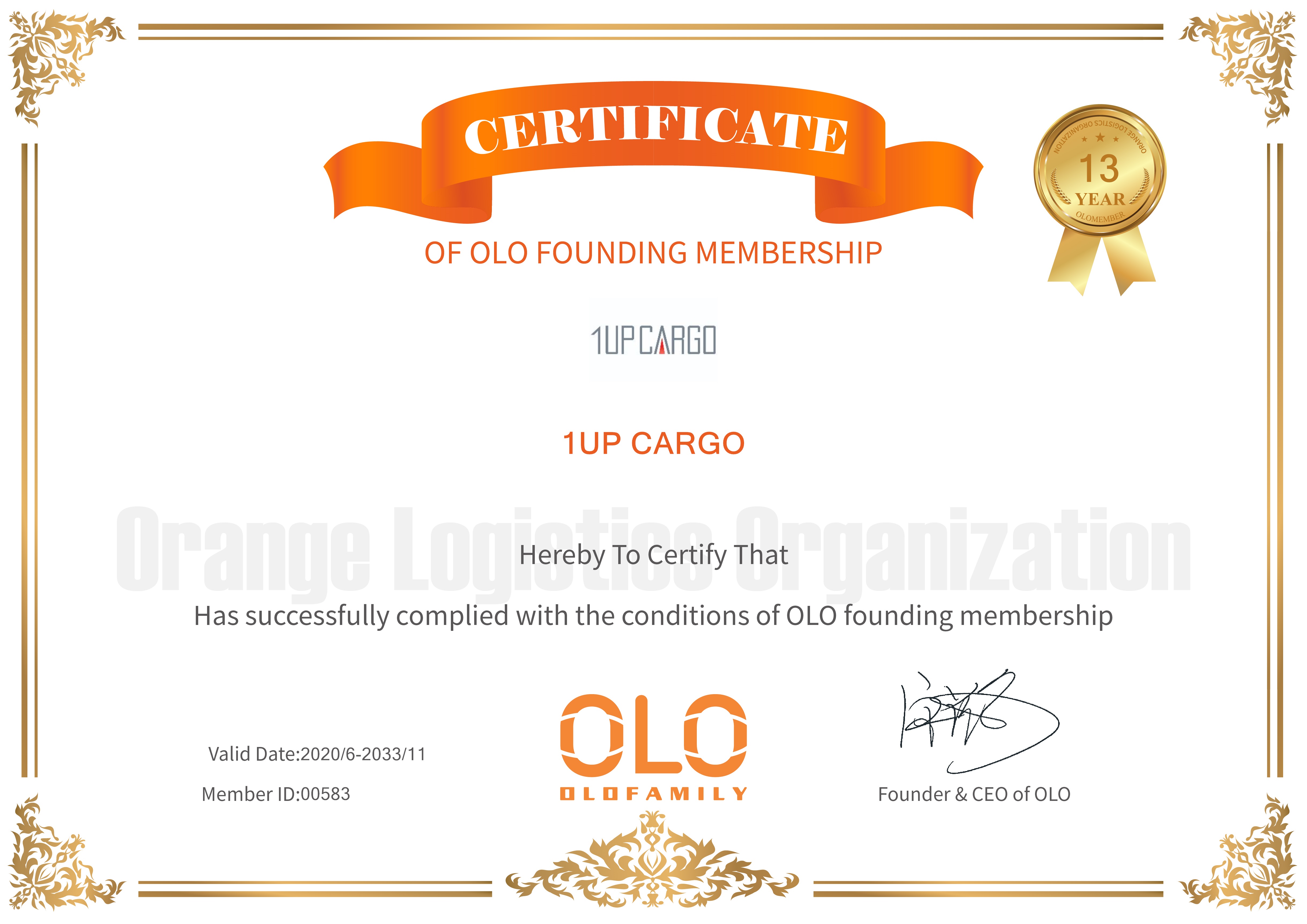 CERTIFICATE OF OLO FOUNDING MEMBERSHIP